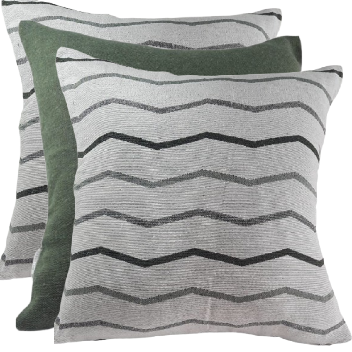 Kit com 3 capas de almofada em tecido Jacquard, com design elegante em tons de branco cinza,e verde Ideal para renovar a decoração do seu ambiente com praticidade.