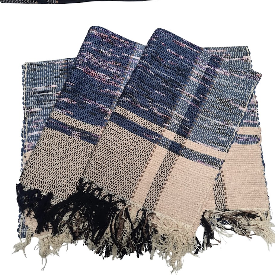 Kit 3 Peças de Tapetes Artesanais em Fio de Malha Moldura com tons Coloridos. O conjunto inclui 1 tapete de 50x150cm e 2 tapetes de 50x75cm, todos produzidos manualmente em tear artesanal, com acabamento em nós nas pontas que garantem charme e autenticidade. Com design de moldura pontilhada em azul marinho, os tapetes são ideais para compor ambientes acolhedores, modernos e cheios de personalidade, trazendo conforto e estilo para salas, quartos e corredores.