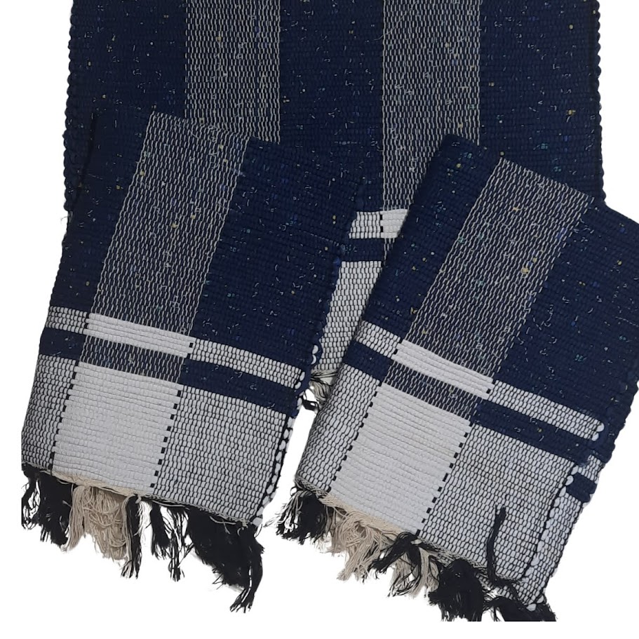 Kit 3 Peças de Tapetes Artesanais em Fio de Malha Moldura Pontilhada com tons Azul Marinho. O conjunto inclui 1 tapete de 50x150cm e 2 tapetes de 50x75cm, todos produzidos manualmente em tear artesanal, com acabamento em nós nas pontas que garantem charme e autenticidade. Com design de moldura pontilhada em azul marinho, os tapetes são ideais para compor ambientes acolhedores, modernos e cheios de personalidade, trazendo conforto e estilo para salas, quartos e corredores.