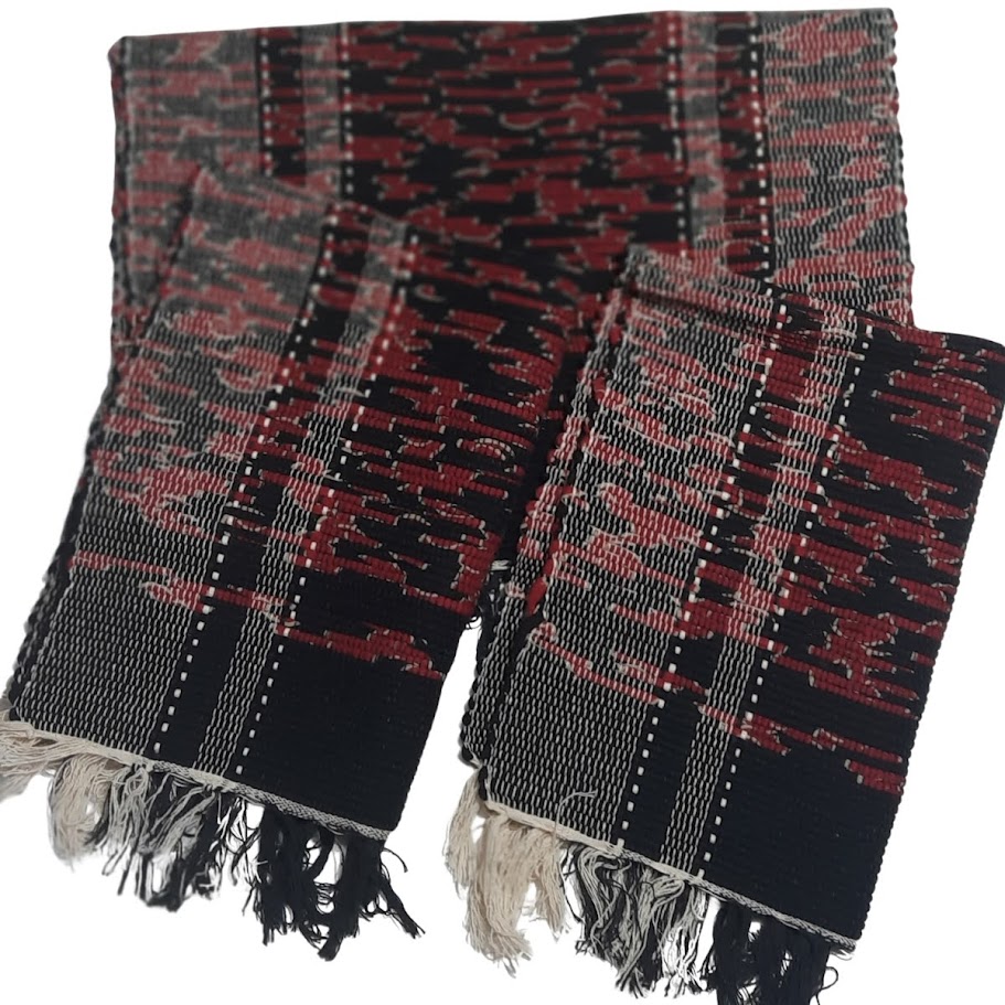Kit 3 Peças de Tapetes Artesanais em Fio de Malha Moldura com tons Preto/Bordô. O conjunto inclui 1 tapete de 50x150cm e 2 tapetes de 50x75cm, todos produzidos manualmente em tear artesanal, com acabamento em nós nas pontas que garantem charme e autenticidade. Com design de moldura pontilhada em azul marinho, os tapetes são ideais para compor ambientes acolhedores, modernos e cheios de personalidade, trazendo conforto e estilo para salas, quartos e corredores.