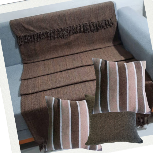 Este kit oferece uma combinação harmoniosa de manta e almofadas em tons terrosos, ideal para dar um toque aconchegante e elegante ao seu ambiente.