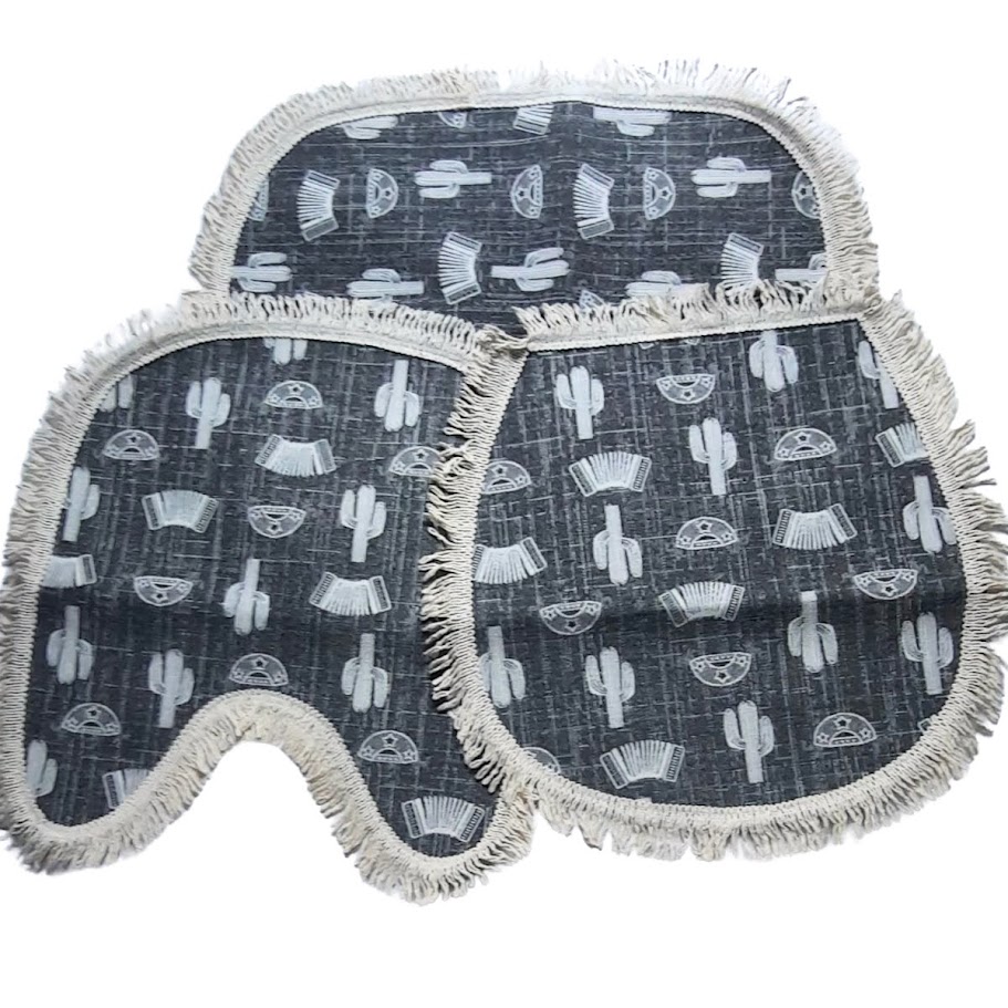 Kit Tapete 3 Peças Antiderrapante p/ Banheiro cor Cinza – 1 tapete para pia (42x54 cm), inclui 1 tapete para frente do vaso (42x45 cm) e 1 tampa para vaso (42x45 cm). Confeccionados em 85% algodão e 15% poliéster, oferecendo conforto e durabilidade para o seu banheiro.