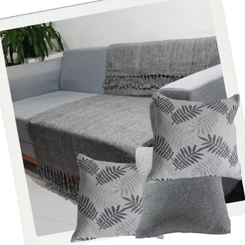 Este kit oferece uma combinação harmoniosa de manta e almofadas em tons Cinza e branco e verde ideal para dar um toque aconchegante e elegante ao seu ambiente.