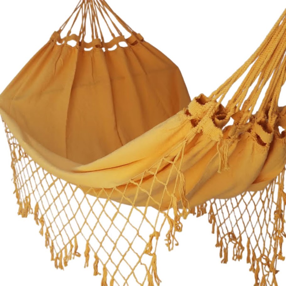 Rede de Descanso Casal Art Tertulian, confeccionada em tamanho 1,50x3,50m, na elegante cor Amarela com acabamento em franjas laterais que realçam o toque artesanal. Perfeita para transformar qualquer espaço em um verdadeiro refúgio de paz, une conforto, resistência e estilo. Ideal para momentos de relaxamento no quarto, varanda ou área externa, trazendo acolhimento e charme à decoração.